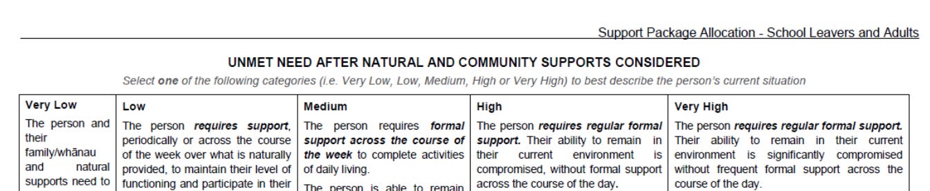 This unpaid work is typically referred to in government documents as “natural supports”. Support Package Allocation (SPA) Guides (which have not been updated since 2016!), include the existence of natural supports as a mechanism to reduce the level of disability support offered to families.